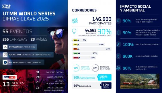 Impulsado por equipos locales profundamente arraigados a sus territorios, UTMB®️ World Series reunió en 2025 a 146.933 corredores y corredoras en 55 eventos, con 266 carreras en 28 países de los cinco continentes. En total, se recorrieron 8,9 millones de kilómetros, el equivalente a casi 222 vueltas a la Tierra, y se acumularon 470 millones de metros de desnivel positivo,lo que equivale a 53.100 ascensiones al Everest.