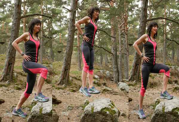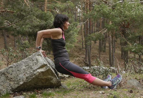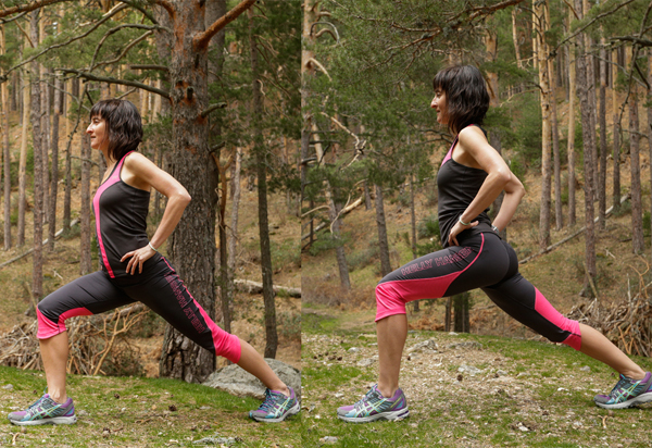 5. ZANCADAS: andar con zancadas amplias. Mantén la espalda recta y la amplitud de zancada es la que te permite tener la rodilla en ángulo recto. Posiblemente al principio te cueste llegar a 90º, empieza con ángulos más cómodos.