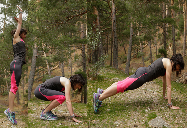 2. CUATRO TIEMPOS: es la unión de cuatro elementos en una misma serie. Comienzas haciendo un salto vertical con los dos pies, bajas hasta cuclillas, estiras las piernas hacia atrás de modo que te quedas en posición de fondos, haces un fondo de brazos y deshaces el movimiento para volver a saltar...